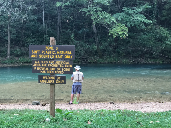 While I settled into a routine of exercise, image processing and blog writing, Vivian set out to make the most of her stay on the river. Fishing at Bennet Spring is an orchestrated event. You can’t just go in there and start fishing willy nilly. Oh no, there is a rhyme and a reason, and you better know the rules of the game. First, you must get the lay of the land. The river is divided into three zones as follows: Zone 1 permits flies only, Zone 2 permits flies and artificial lures only, and Zone 3, permits only soft unscented plastic bait & natural and scented bait.