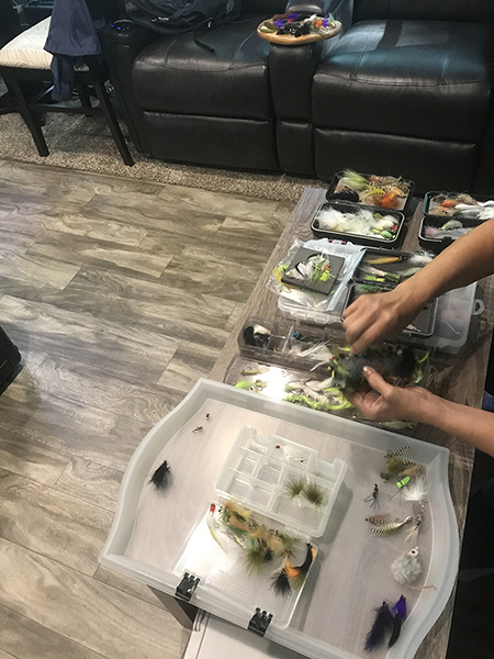 Much of Vivian’s spare time (when she is not fishing) is to prepare for and learn about different fish species she will encounter on our travels & how to lure and catch them. And she is learning how to tie flies. In addition to watching an inordinate number of YouTube videos narrated by slow talking fishermen who are willing to share every detail of their fly tying skills, Vivian collects animal parts and tries to make them look like insects. And often as she is hunched over the table with said animal parts and lots of shiny twine, I can hear mumbling words like “I am going to need new eyeglasses”.