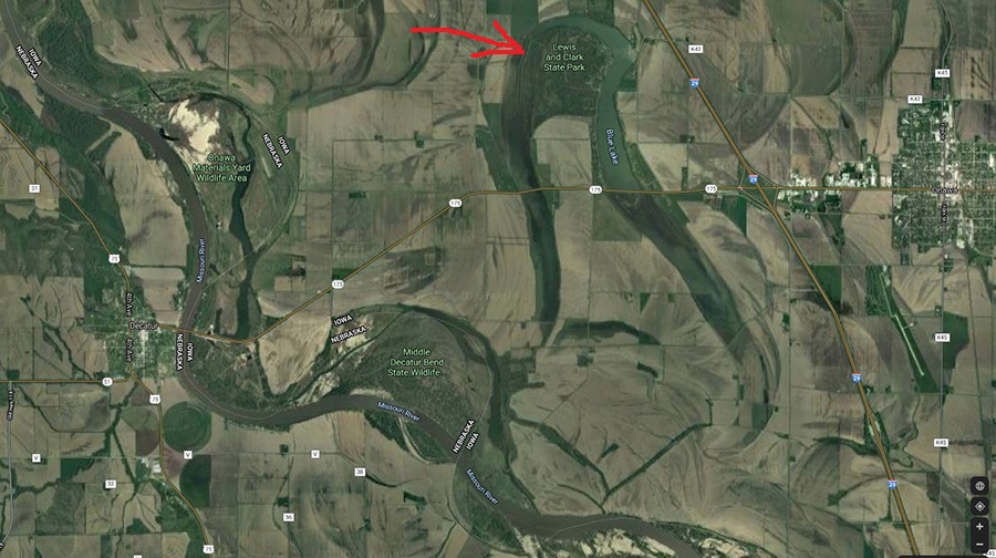 From satellite images, you can see the U-shape or oxbow formed by the Missouri River. The state park its in the middle of the “U”.