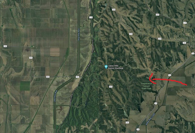 A satellite image can distinguish the identifiable Loess HIlls topography from the flat prairie. We spent a day hiking within Preparation Canyon State Park, marked by the arrow.