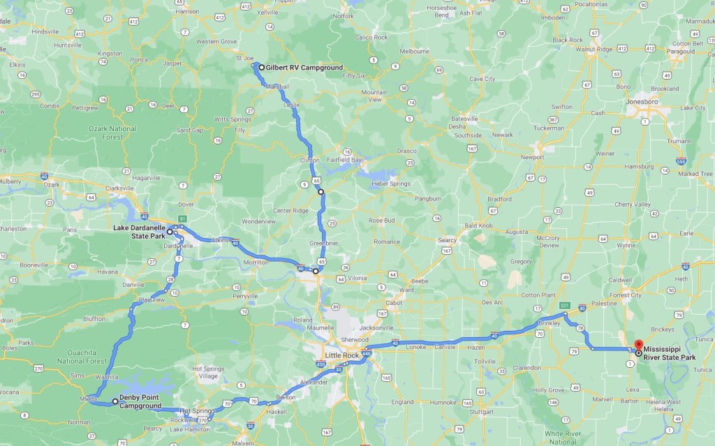 Our tour through Arkansas included four stops, each of which would give us lots of time on the water. It began in the Ozark Mountains and was to end at the Mississippi River.