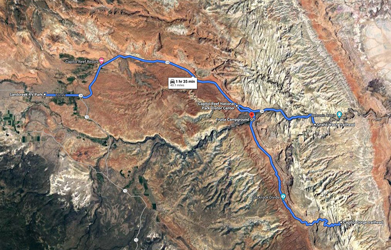 A view of Capitol Reef with our campground location to the west and the routes to the Capitol Gorge and Grand Wash hiking trails.