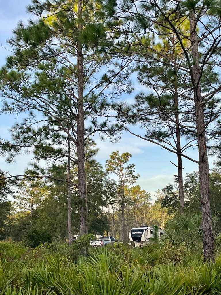 There is no beach or spring-fed water filled with manatee, nor is the campground itself on the water. Instead, it is within central Florida’s wetland and pine flatland territory, home to much wildlife including otter, eagle, deer, alligator, and wading birds, all of which we saw while there for a short 2 nights. With lots of hiking trails, a couple lakes to kayak on and a paved road with little traffic for bicycling, you could enjoy this park for an extended time easily.