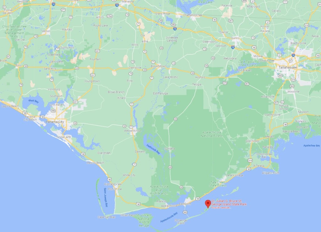 St George Island is a barrier island in the Apalachicola Bay and about 80 miles south of Tallahassee, Florida’s state capital.