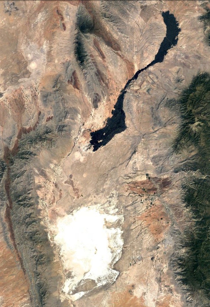 This satellite view shows a striking contrast between White Sands and the Carrizozo Lava Field. The Valley of Fire Recreation Area is part of the lava field, on the north end.