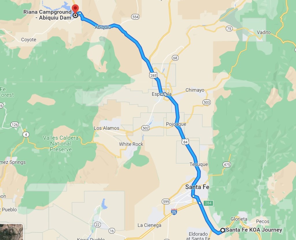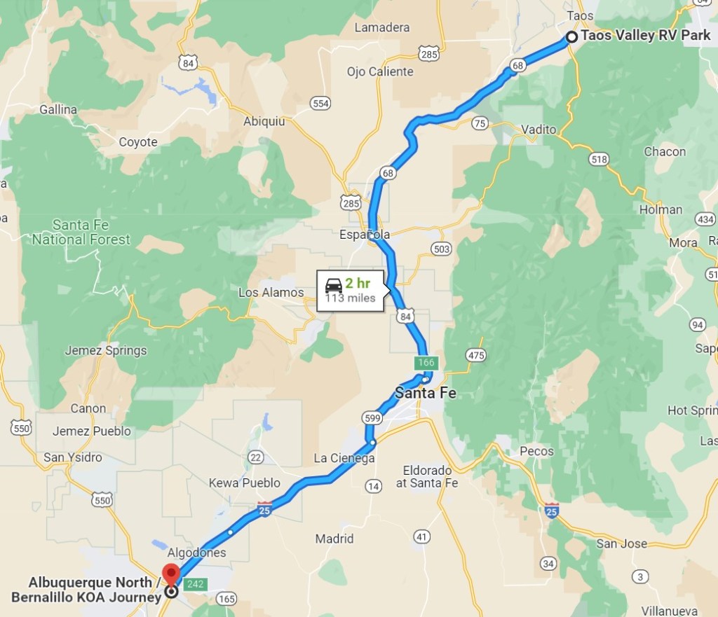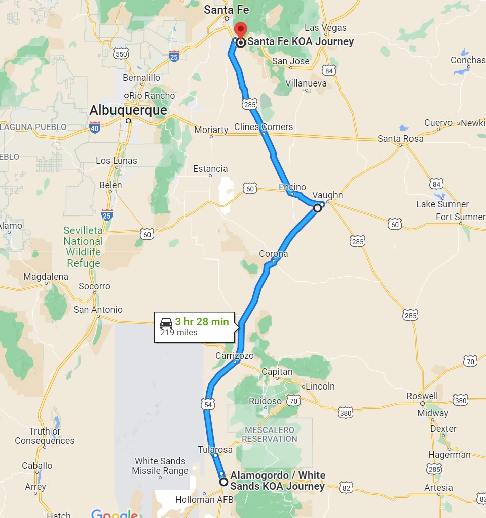 The highways on this 219-mile route to Santa Fe KOA were wide and well maintained. With a few stops along the way and decent cell phone signal, it never seemed too desolate. This route was at least 50 miles less than the alternatives which included I-25 through Albuquerque.