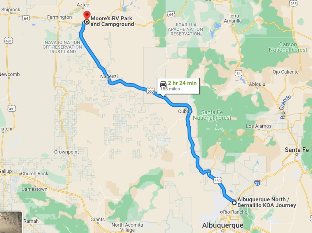 Our final stop in New Mexico before entering Utah was Moore’s RV Park and Campground in Bloomington. From Taos, we stopped over at the Albuquerque North/Bernalillo KOA for one night before heading north on Highway 550.