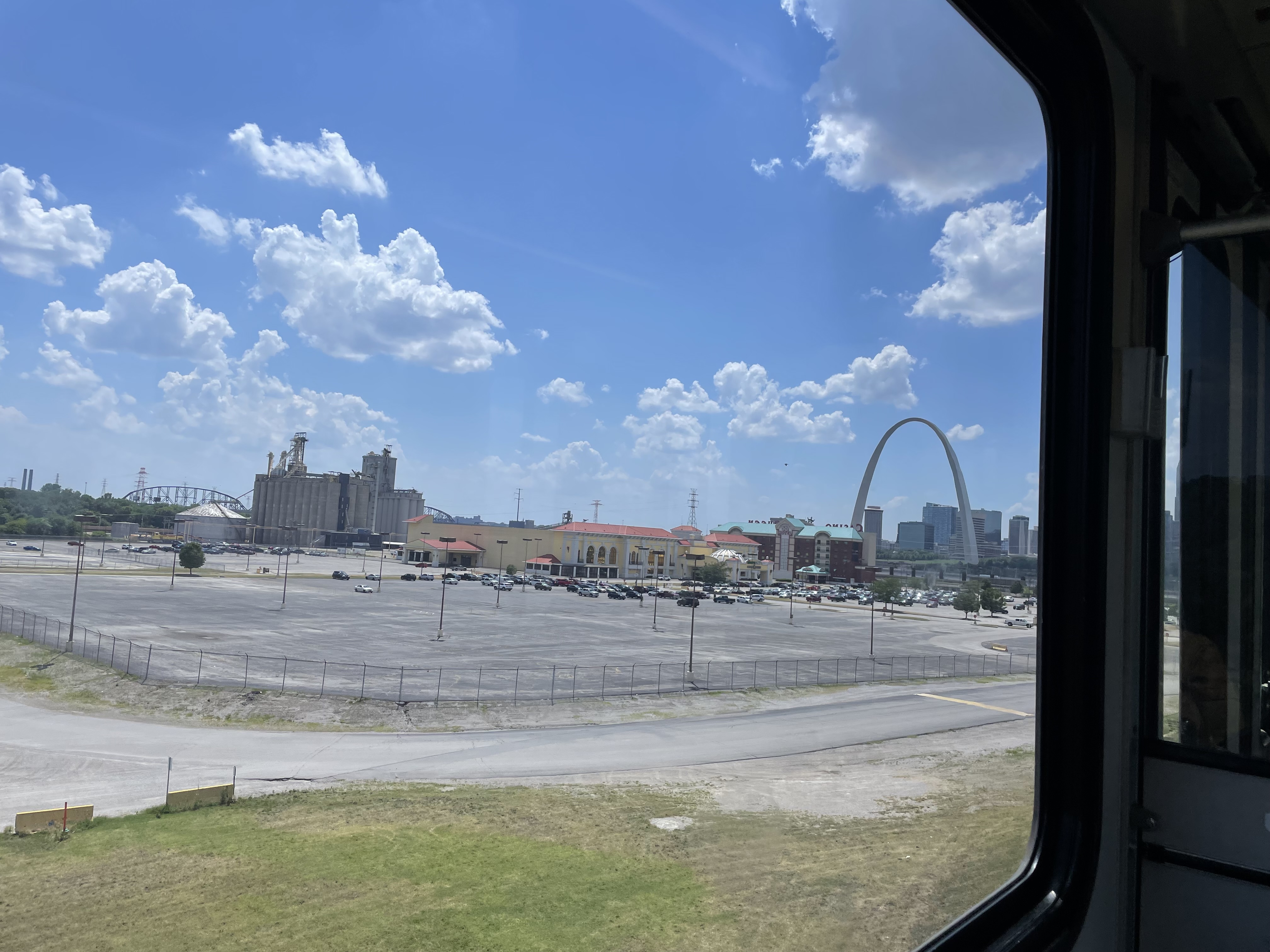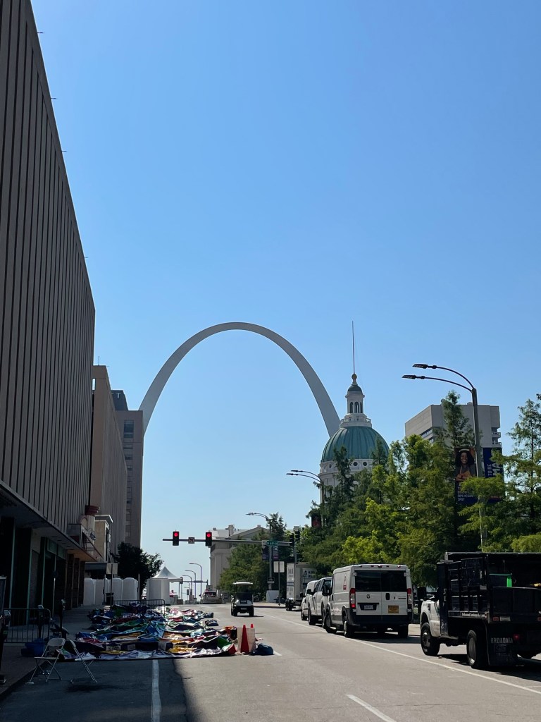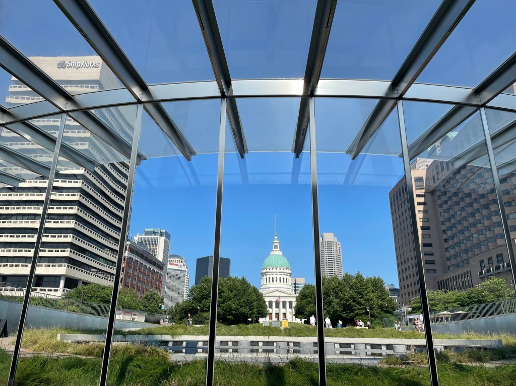 By 8 am, we arrived in St Louis to see the city’s recovery from the 4th of July festivities. Scattered about the streets and avenues of the central downtown area was much evidence from the previous night’s celebration where hundreds of people viewed the fireworks over the 630-ft tall Arch while consuming adult beverages and assorted food truck munchies. City workers were busily cleaning up the grounds and tearing down the bandstands as we walked from the 6th & Pine Metrolink station through Kiener Plaza to the Old Courthouse that stands stately yet eclipsed by very tall modern buildings. You wouldn’t know it to look at it, but this was National Park territory. Unfortunately, the courthouse was under renovation and all we could do was watch a Park Ranger enter the building.