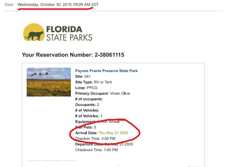 - For popular state and national parks, you may need to reserve at the beginning of the reservation window. Here in Florida that’s 11 months!