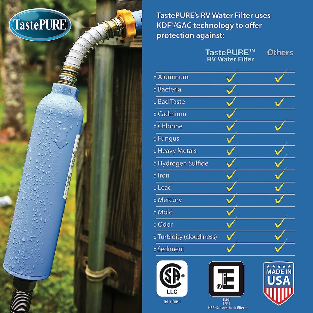 No matter where you go, you need drinking water and you need to maintain the integrity of the RV water system. We do a couple things to ensure the water we drink is safe and reduce bad taste and sediments. One thing we do is attach an inline water filter to our inlet hose, it’s kind of a first line of defense. I use the Camco filters and compared to a much cheaper one that I tried, it works very well and I won’t go cheap again. I typically change it out every 3 months, sometimes less depending on locations.
