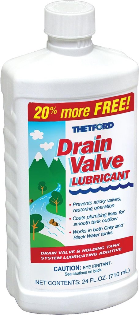 Several previous tips have been about useful gadgets to help with getting water into the RV and getting the waste out. I’ll continue with that one more time with this little recommendation –Thetford’s Drain Valve Lubricant. A little bit goes a long way, as I add it occasionally to each of the tanks, mostly the black tank. Pour about 1/2 cup down the toilet after emptying the tank. Your tank valves will thank you for that and make your life easier too!