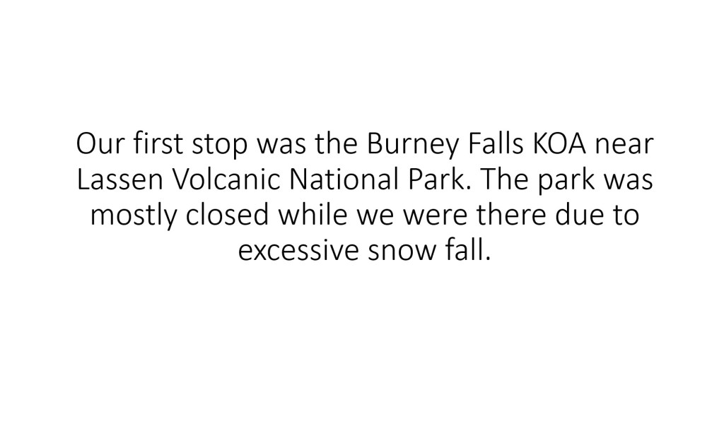 Our route from Gold Ranch RV Resort to Burney Falls KOA, to Diamond Lake RV Park and last, Expo Center RV Park in Bend, Oregon. Red arrows indicated points of interest, Lassen Volcanic National Park, Crater Lake National Park, and Newberry Volcanic National Monument.