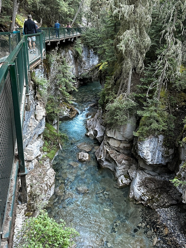 We intended to visit the canyon one late afternoon following the crowds, but instead, we drove into the 3/4 full parking lot at about 8:30 am. This was after we learned that our guided hike to Hidden Lake was cancelled. Our first full day of exploring Banff National Park with our friends commenced unexpectedly at Johnston Canyon which eased us into the crowds that prevail in these popular locations. While the canyon walls carved by Johnston Creek are an impressive display of the Rockies, it was how the park created an experience within the canyon for even the least likely person to get out and hike that impressed us the most.