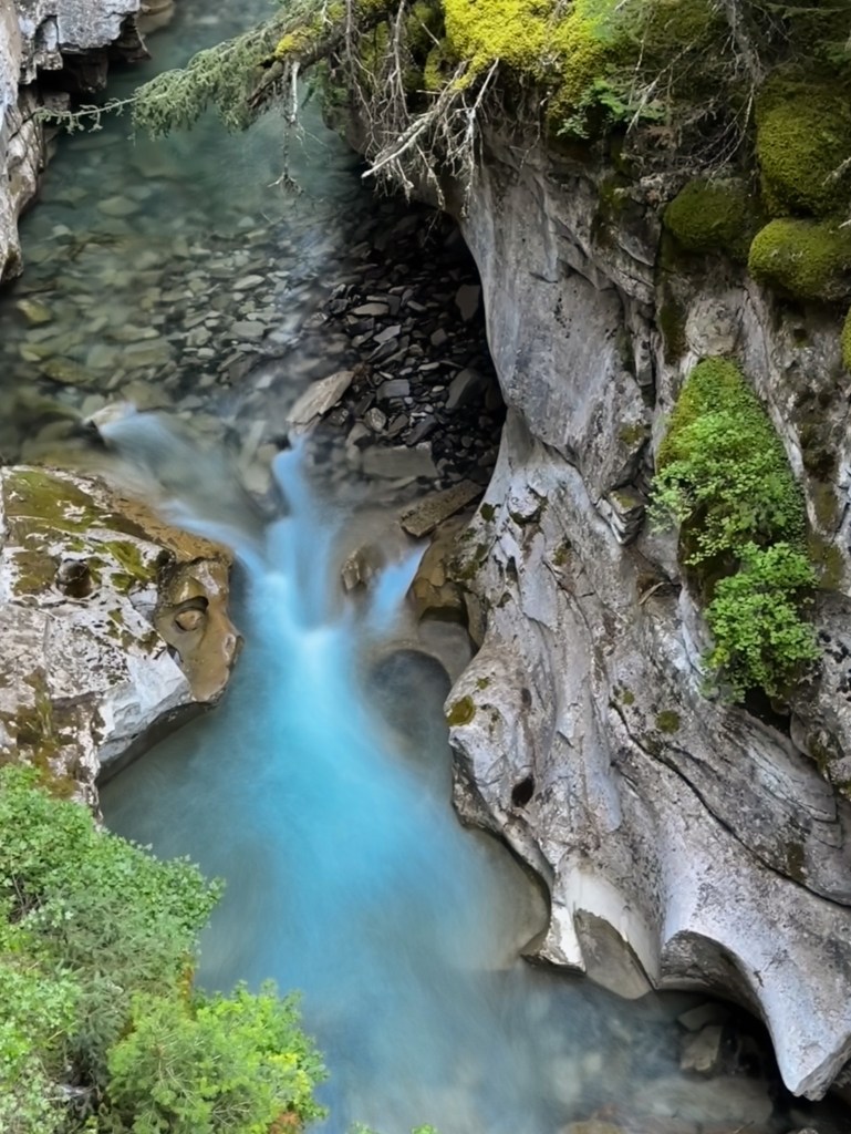 Starting in a glacial valley, Johnston Creek flows eventually to a gorge known as Johnston Canyon. Then it empties into the Bow River between Banff and Lake Louise. The canyon is an impressive display of erosion that has created sheer canyon walls, waterfalls, tunnels and pools. A man-made bridge allows you to look straight down into the canyon, several dozen feet above the powerful water accelerating its way down the rocky inclines over boulders and trees, continually carving away at the walls of the canyon. Somewhere above us, the water escaped its icy tomb to fall over a rugged landscape and eventually entering the Bow River headwaters where it will continue a more gradual journey east to the prairie flatlands.