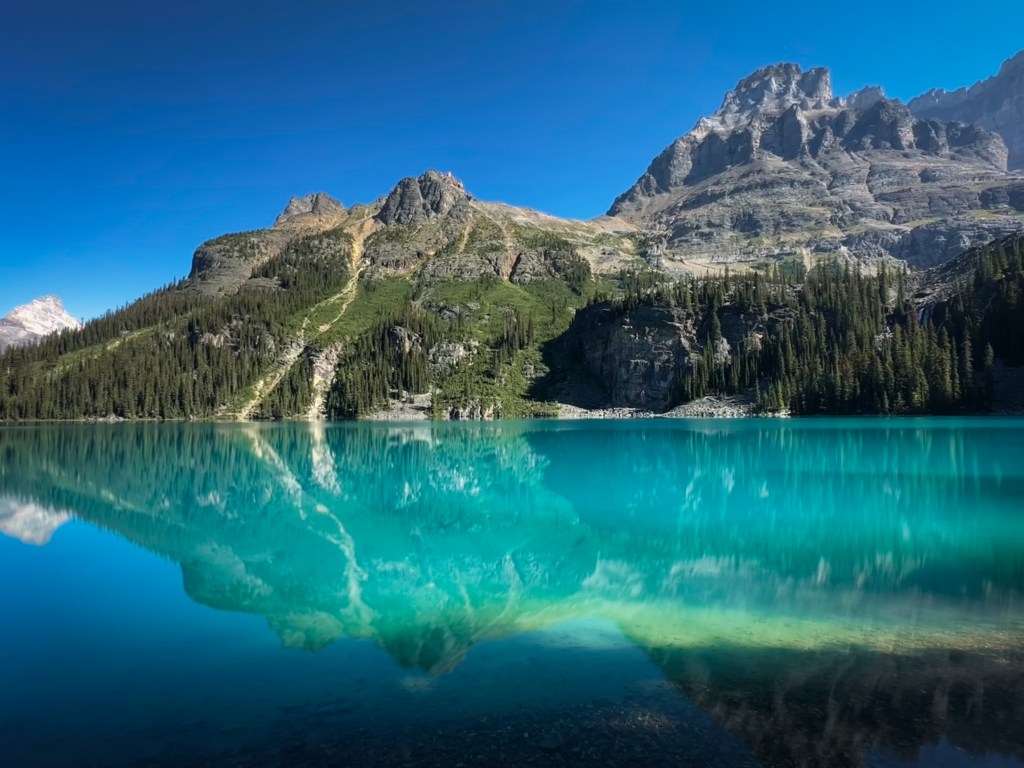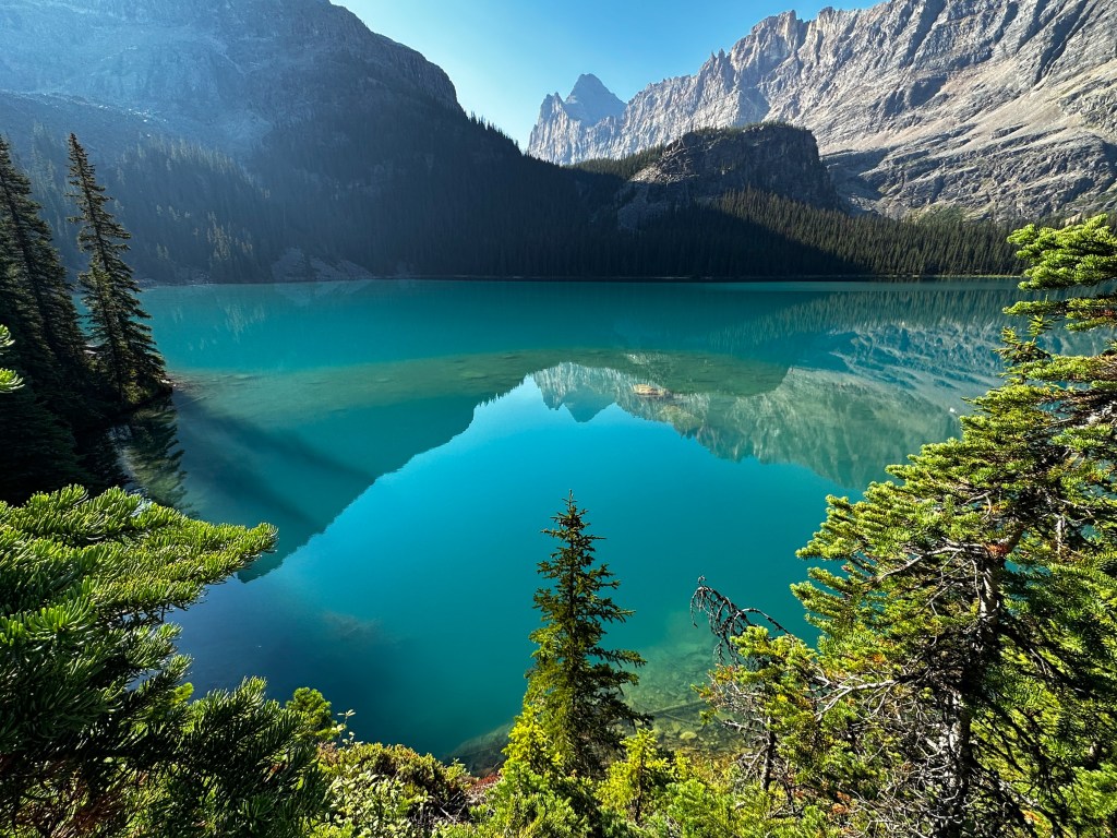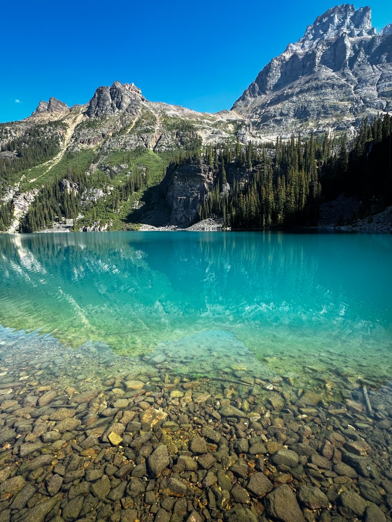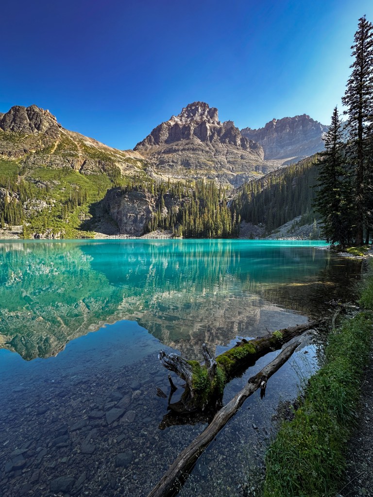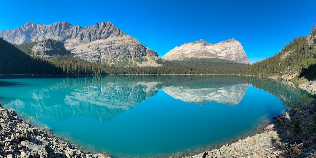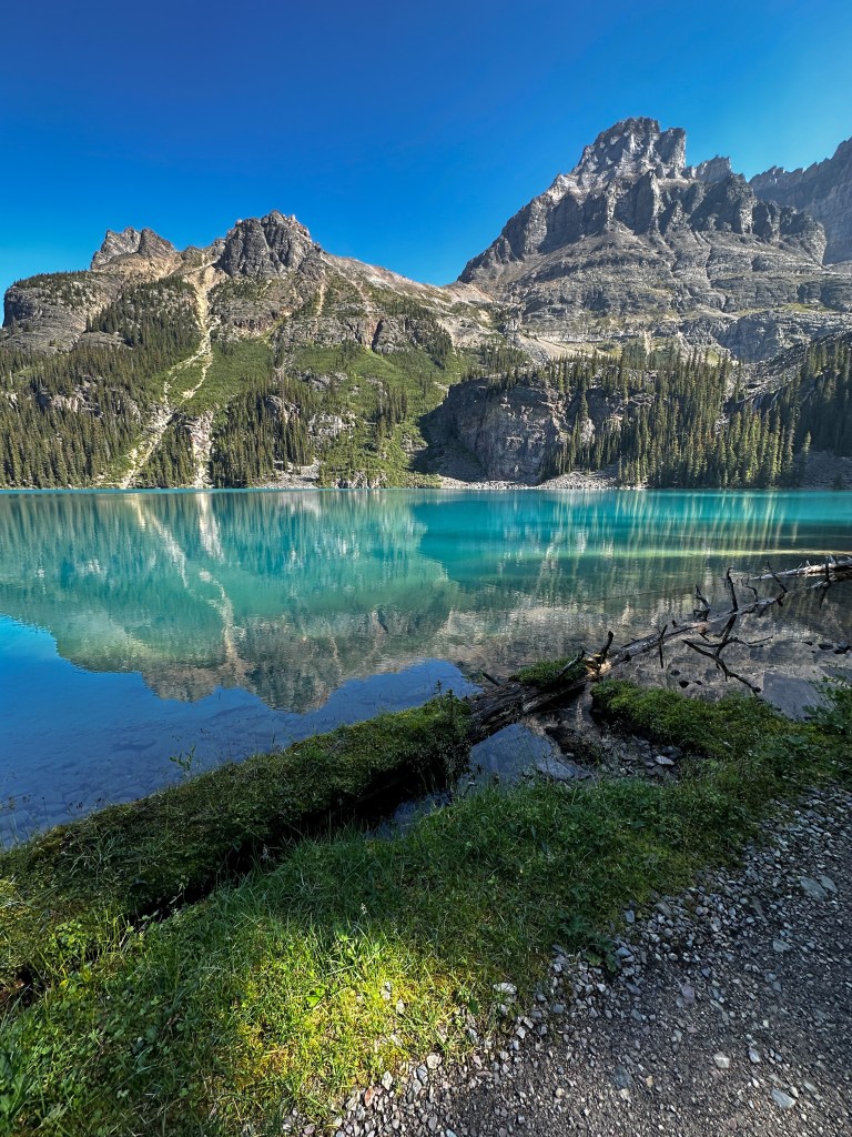Johnston Canyon was a good start in Banff, but for us, it could not live up to the alpine lakes of the Canadian Rockies. The next day, we drove out of Banff National Park to the adjacent Yoho National Park where a reserved shuttle awaited us to take us to Lake O’Hara. Without the reservation, one would need to walk seven miles on a gravel road up a grade until reaching the lake. The hike around the lake is about 3 miles, mostly easy but with some drop offs and inclines.