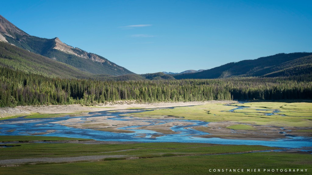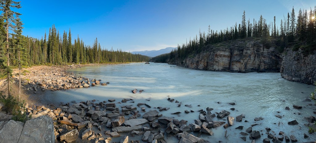 Only a short distance from the falls, the water of Athabasca River continues its journey in a peaceful manner.