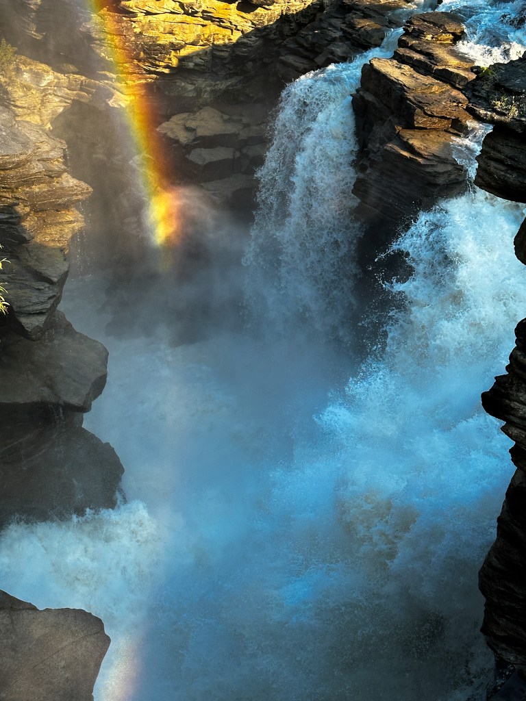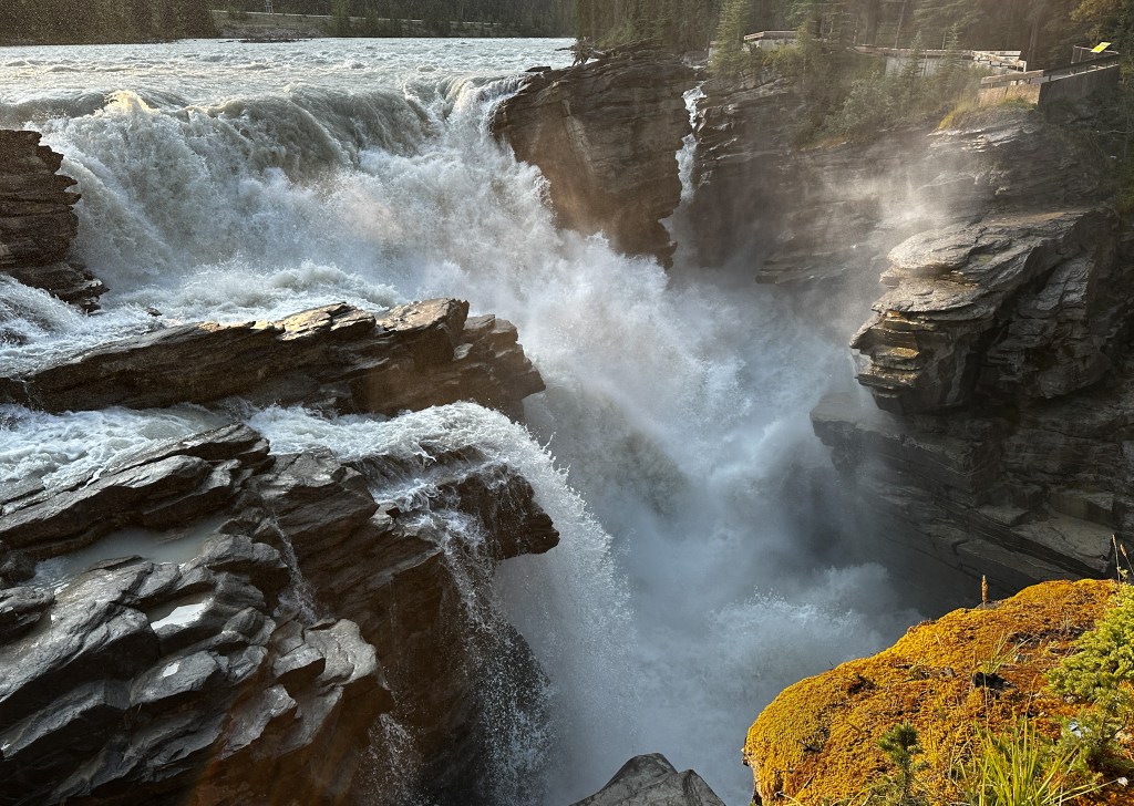 Witness Athabasca River’s breathtaking display of erosion. People standing on a narrow bridge looking down at the roaring waterfalls must conjure all kinds of imaginations because there are very few opportunities for just anyone to view an impressively beautiful force of nature. Some will look in awe and see God, most will be mesmerized by the sight and sound of water, artists will see light playing with shapes and colors, and some I am sure will have fleeting thoughts of falling and succumbing to the merciless water. I think some will wonder how something so extraordinarily beautiful and far beyond our own significance can exist – and perhaps a handful of them will feel grateful to have seen it.