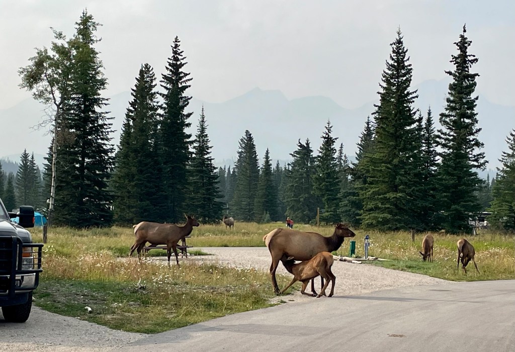 Despite the repellant effect of loud talking on the hiking trail, we did see animals in Banff and Jasper National Parks in a variety of other ways. For example, the dozens of elk hanging out near our campsites became so commonplace we mostly ignored them after a few days. These elk were cows and calves, some youngsters still dependent on mom. Among them were young bulls at least a year old because their antler spikes, which grow an inch per day showed noticeable growth during our 12 days.
