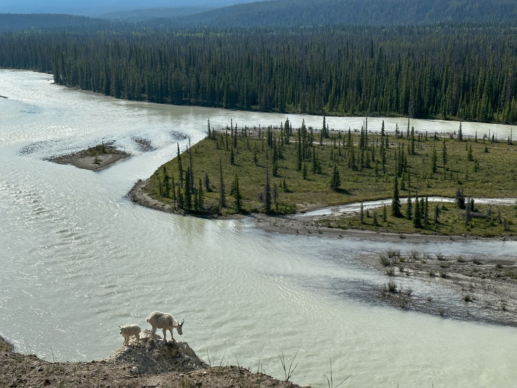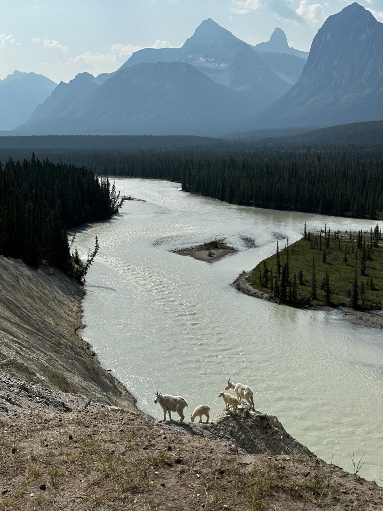 Then there were the mountain goats that appeared out of nowhere on a steep mountain grade while we stood at the Goats and Glaciers Overlook alongside the Icefield Parkway. The two nannies and two kids wandered around for several minutes, long enough for us photograph them with the glaciered mountains and Athabasca River in the background.
