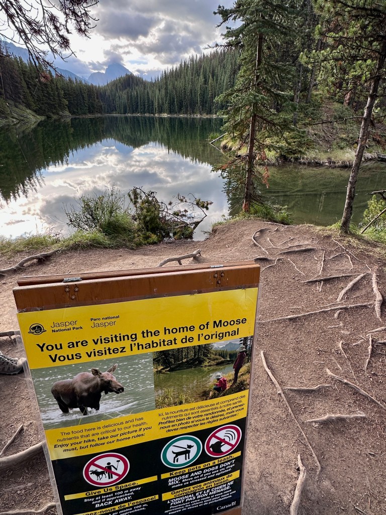 While in Banff and Jasper National Parks, we learned to say ‘Hey bear’ in French. After all, national park signage includes both English and French wording. We added the Spanish version as well because we wanted to make sure a lurking bear could understand us. Learning the Chinese version of “Hey bear” might also have been helpful given the number of Chinese tourists in Banff and Jasper. – “Hey bear”, “Hey ours noir“, “Hey oso negro”. Speaking loud and repetitively, we hiked through the montane and subalpine forests, making sure every bear in ear shot would know our presence. The idea of a bear translating human languages is tongue-in-cheek silliness, but it helped keep us on guard because no matter what language you speak, doing so loudly and frequently may help ward off a serious encounter with a very large mammal that has the potential to kill you.