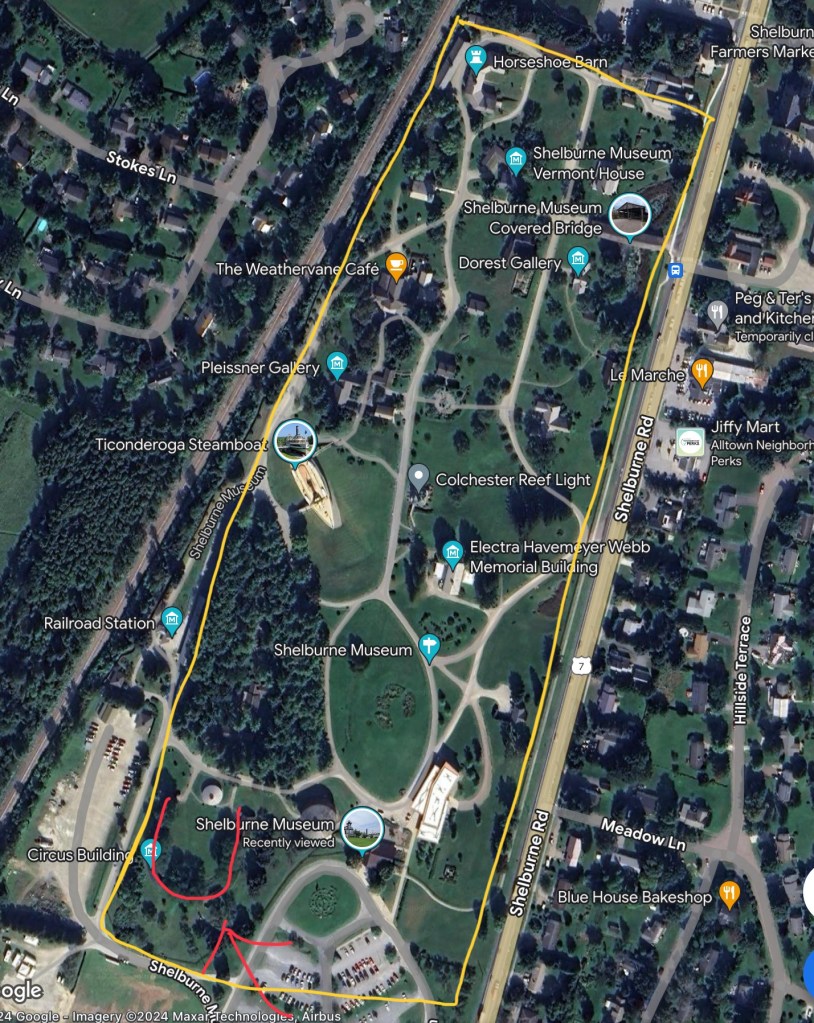 Aerial view of Shelburne Museum. At the bottom left, the red ‘U’ indicates the Horseshoe-shaped 518-ft long Circus Building.