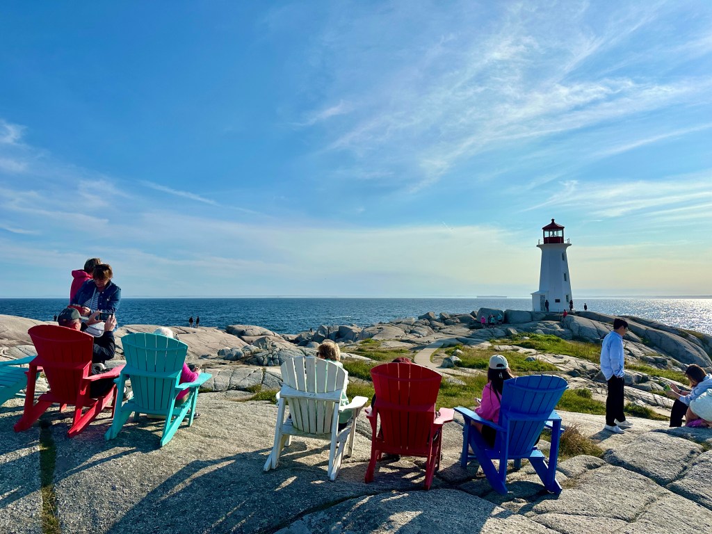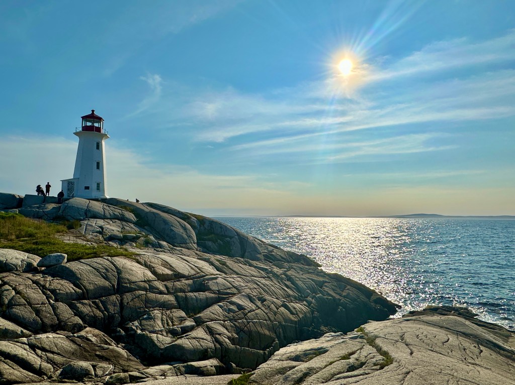 Between Lunenburg and Halifax is another small community, Peggy’s Cove. We arrived there to see the famous Lighthouse with the same name. Canada’s coast has many lighthouses, but Peggy’s Cove is one of its most popular tourist spots and the most photographed Canadian lighthouse. This was obvious when we arrived a couple hours before sunset as hundreds of people swarmed the rocky outcropping where the handsome red and white lighthouse casts its shadow over selfie-taking tourists. Indeed, it is the most photographed lighthouse in Canada with the setting sun behind it.