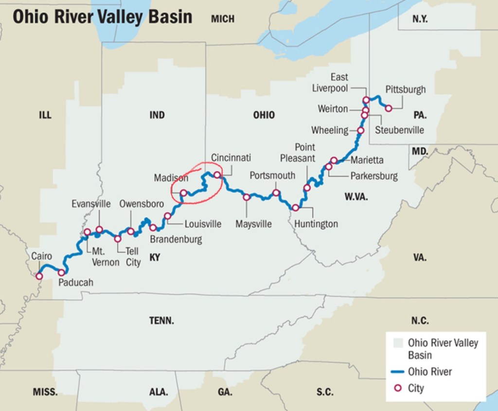Circled in red is the approximate location of our home for 9 days, along the Ohio River.