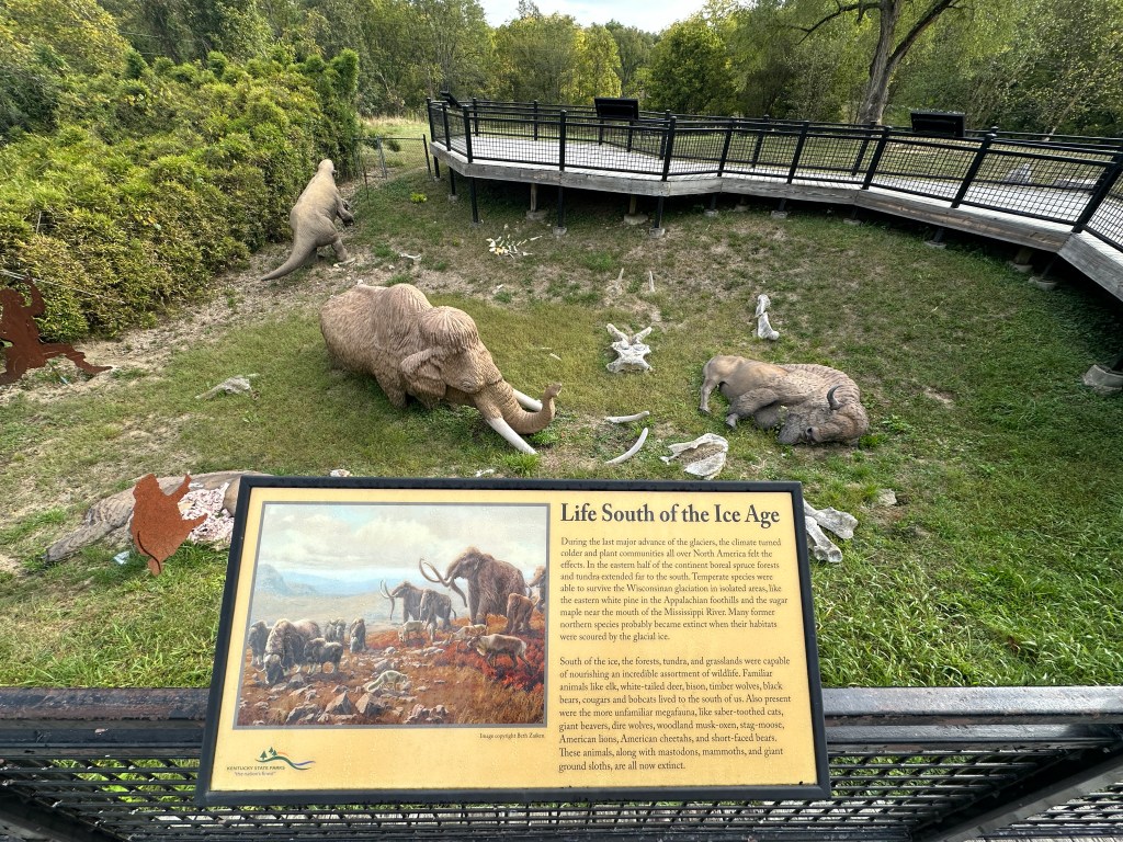 During the Ice Age, the southward movement of large sheets of ice drove animals further south and many of them came to the area, which is now northern Kentucky, not far south of Cincinnati. Here, the giant mastodon, bison, stag-moose, ground sloth and mammoth found a hospitable and life-sustaining environment with abundant mineral springs. That was over 12,000 years ago. What’s left are the bones of these animals.