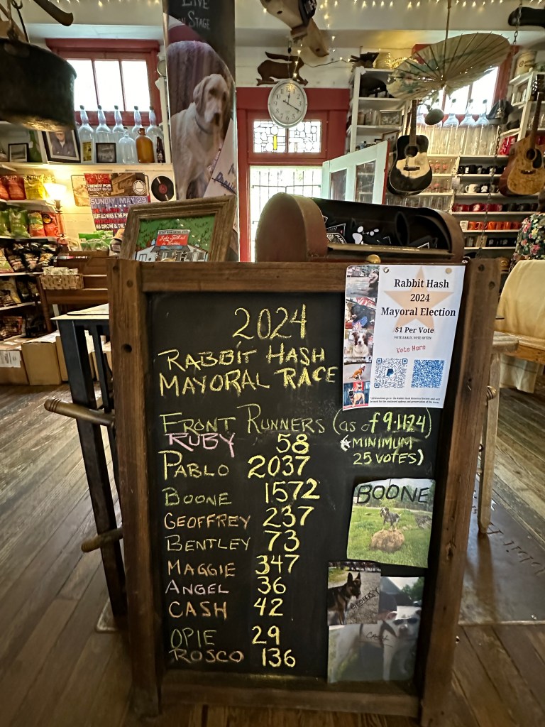 It was on the front porch of the General Store where we met Pablo’s campaign manager. Pablo was one of many candidates running for mayor of Rabbit Hash. It all began in 1998 when no one in the community of Rabbit Hash wanted to be mayor. So, the people did the next best thing, they chose a dog to be the honorary mayor (apparently, cats are scarce in Rabbit Hash).