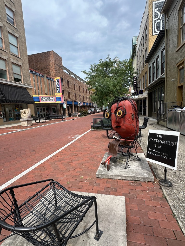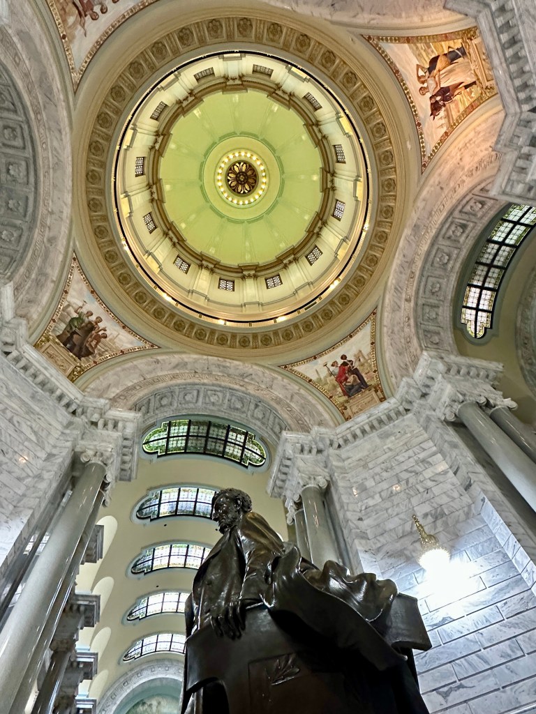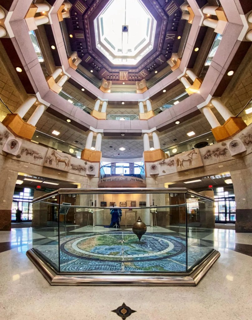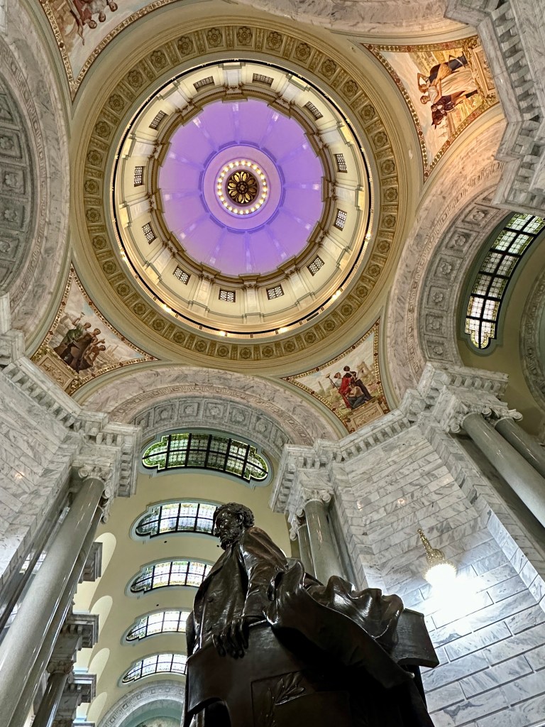 Rain kept us from spending much time in Lexington, but we did get to the downtown Central Library. Throughout our travels, we sometimes take advantage of community public libraries that provide reliable WiFi, but this time, we came to the Central Library for something different. In the library’s spectacular rotunda is a Foucault pendulum and equine frieze by Adalin Wichman. Above is the world’s largest ceiling clock.