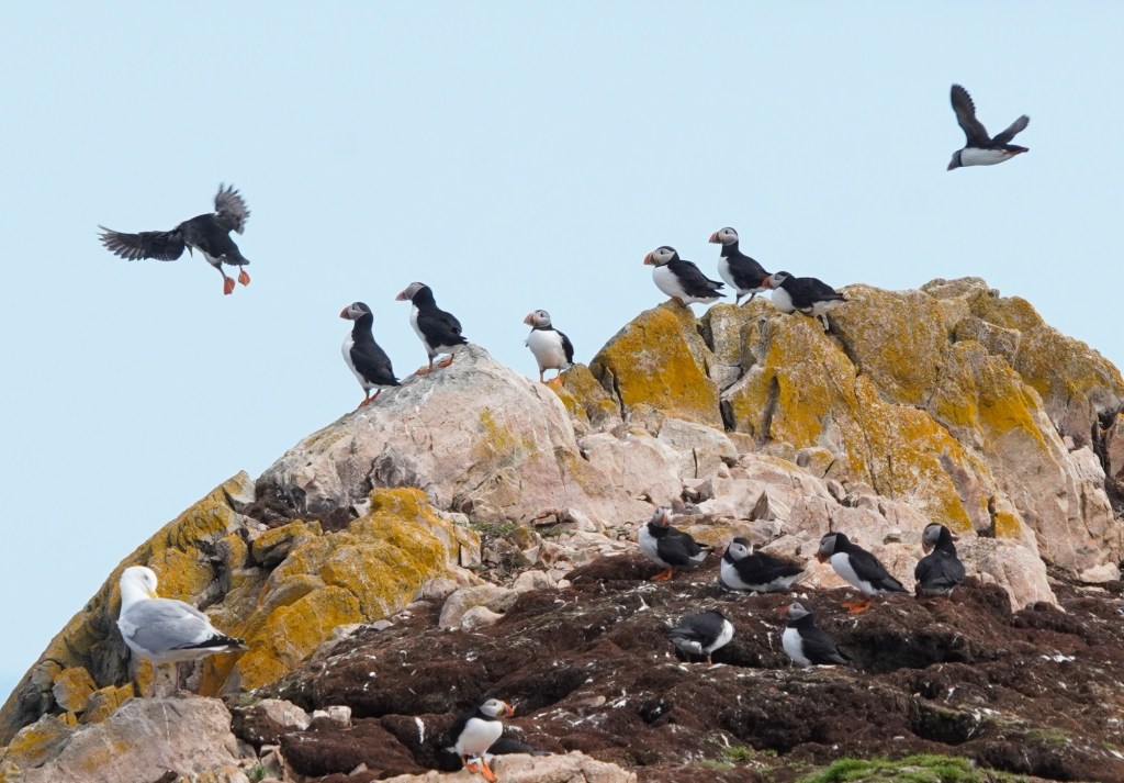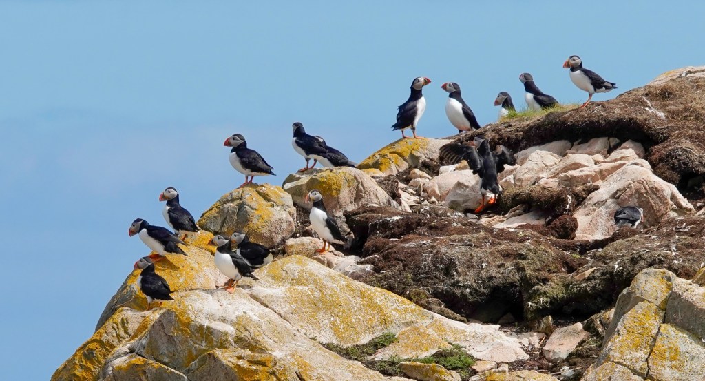 We eventually got to the puffin colony and on a tip from someone, we observed another colony near the Lighthouse on Cape Bonavista. The puffins are the cutest little things, but when you learn about them, you gain a lot of respect for the bird that is often referred to as “the clown of the sea”. The puffins come on land, in this case a tall rocky outcrop island near the jagged coastal cliffs of Trinity Bay, only in the spring to breed and nest. In the fall, they return to sea where they live until the next breeding season. Monogamous couples find their way back to the original nest each year where one egg is laid per couple. At about six weeks, chicks fledge and swim out to sea in the dark, and do not return to land for several years.