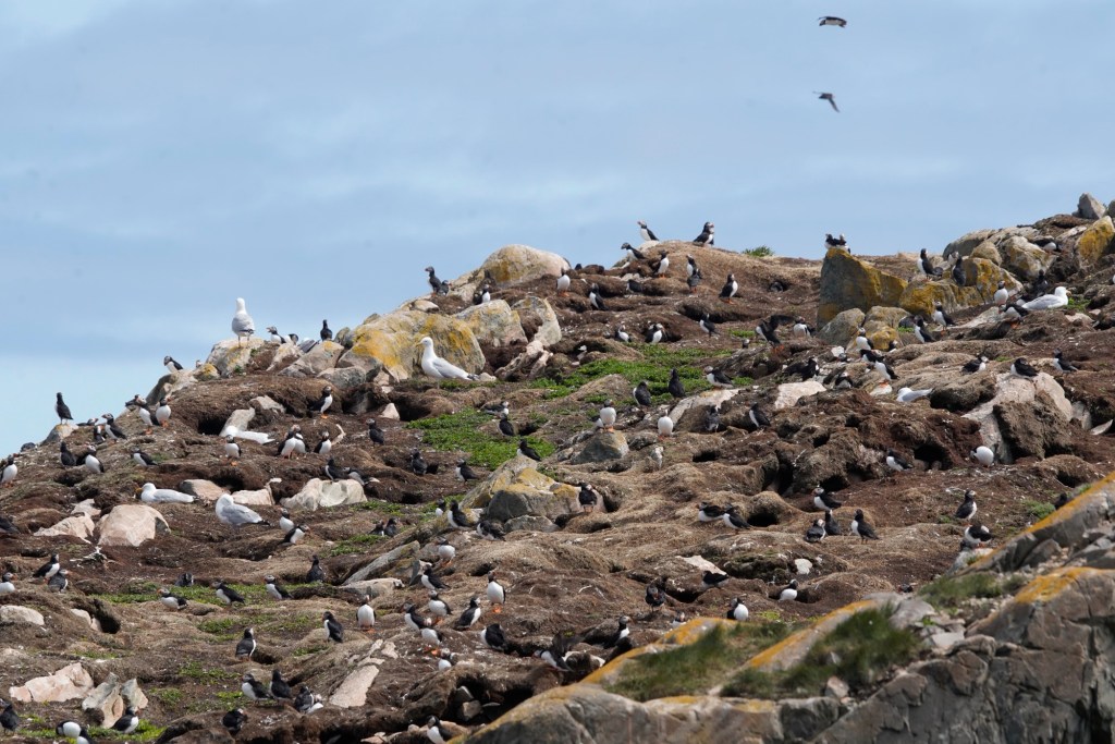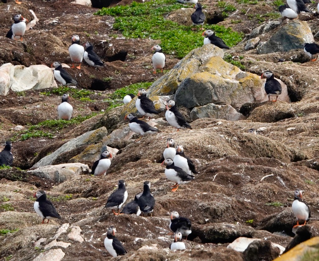 The viewing is along the edge (no guard rails by the way) overlooking a rock island about 200 feet away and where 300 pairs of puffins were tending to their nests. To get to the edge, you must take a path up and over a ridge and at some point cross a narrow portion where there is little room between you and the water below. Dozens of people were coming and going, all there for the same reason.