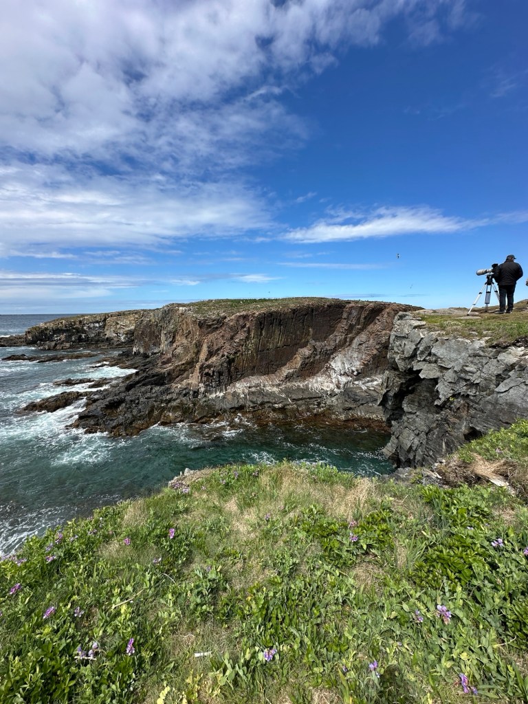 We arrived one afternoon on a warm sunny day. Wearing shorts and t-shirt for the first time in Newfoundland, we drove a half mile from our campground to the parking area for the Puffin viewing. I grabbed the camera and made a beeline to the coastal overlook with Vivian following in my wake.