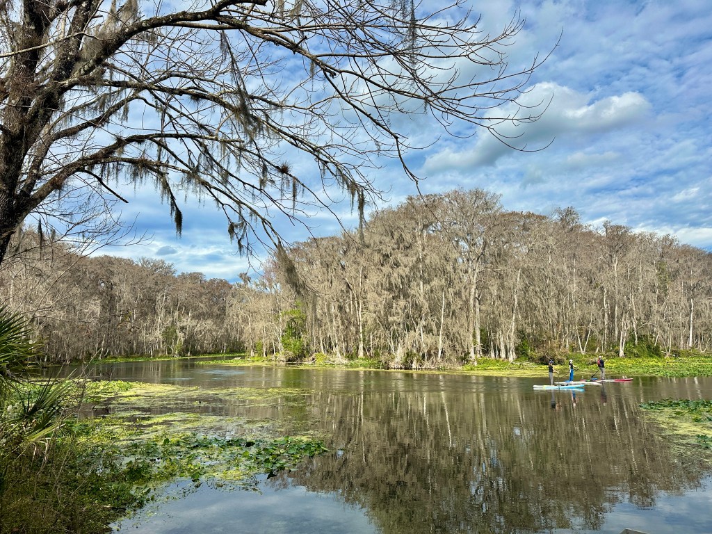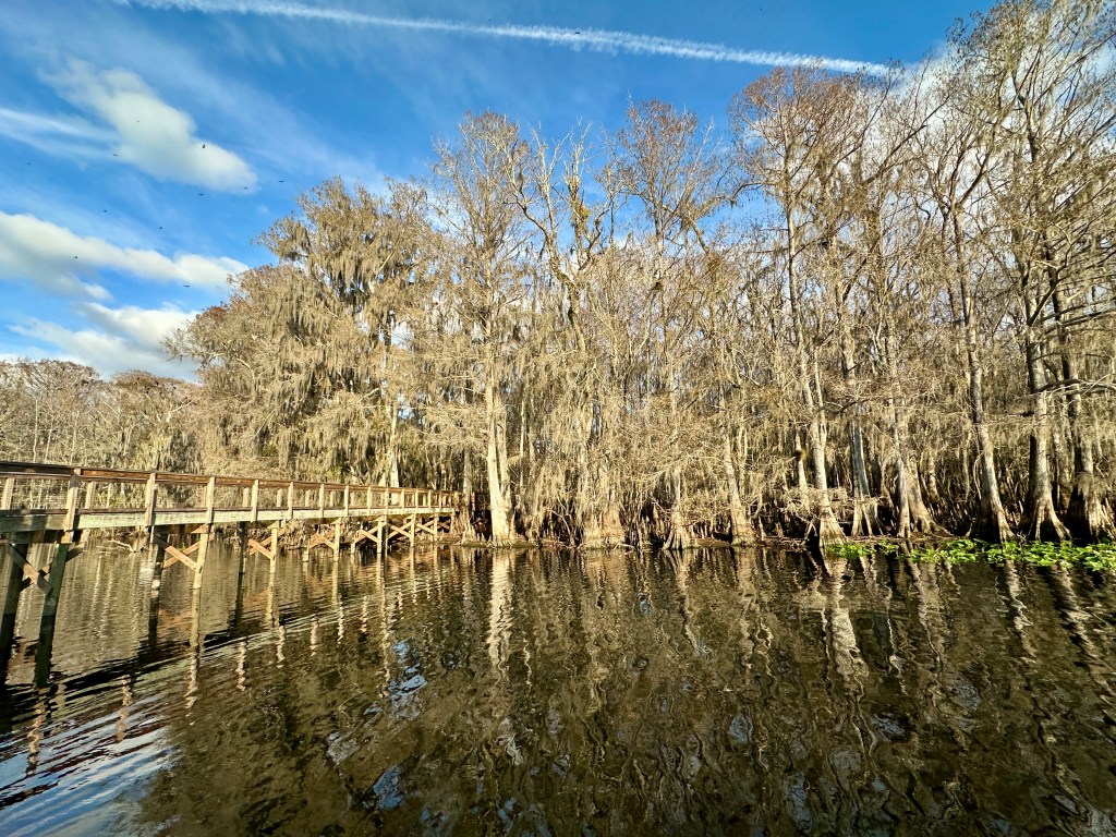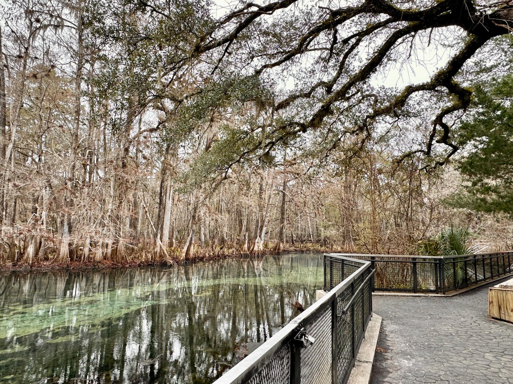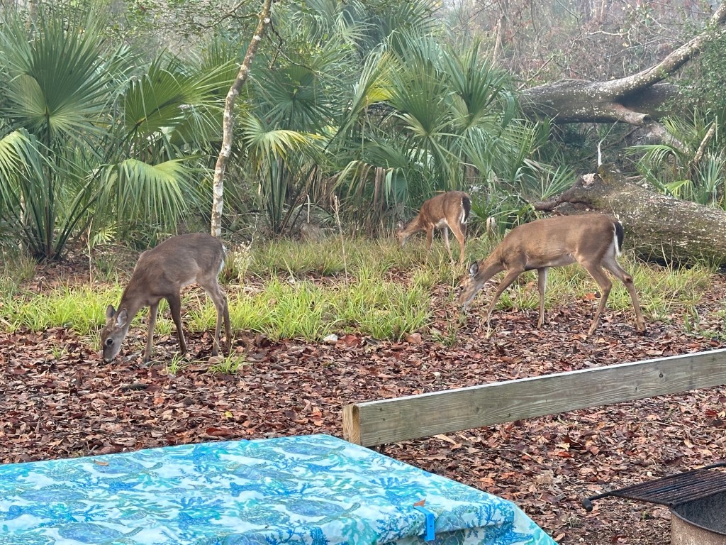 7. Manatee Springs – Manatee Springs connects to the Suwannee River about 45 miles from where the river enters the Gulf of Mexico. In addition to the springs (where cave diving is popular) and the river, there are lots of hiking trails that wind through hardwood forests. The campground is relatively old but is one of a small number of Florida state parks that offers several full hook-up sites. Not all sites can accommodate rigs > 35 ft and some are designated tent-only, so choose your site wisely. I most enjoyed hiking the trails and seeing so many deer. The spring water levels were unusually low when we were there, so no manatees were seen. By the way, I ranked Manatee Springs higher than Silver Springs because the springs are a short walk from the campground and much less crowded.