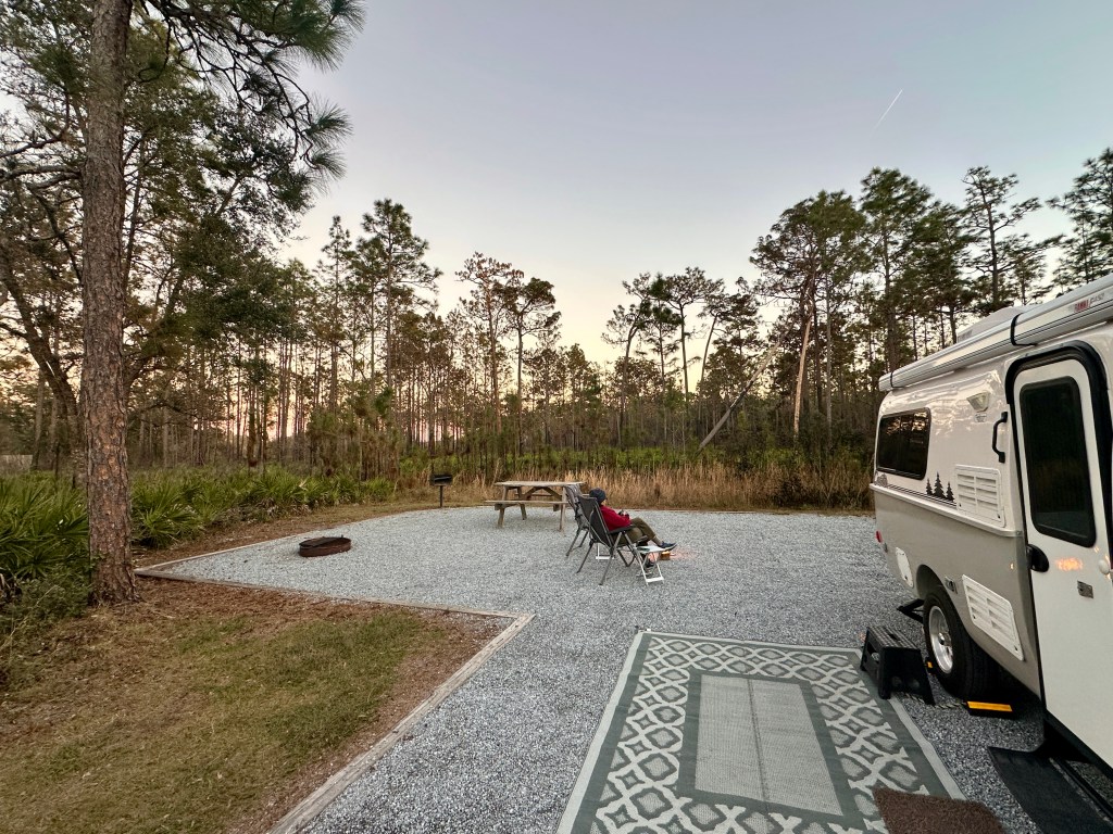 1. Colt Creek – among the parks we’ve camped at, I still can’t believe Colt Creek remains are favorite. Maybe its because every time we come here we feel the stress of life fall away, and always experience silence in the campground only to be interrupted by the call of the barred owl. Or maybe it is because the campground is remote and small, and one of the most peaceful park experiences we’ve ever had. And it is the newest state park campground in Florida since 2018. The park has lots of beautiful hiking trails and lakes within hardwood forests and open prairies. I can take morning walks and not see another human being, only the wildlife including many birds and the alligators living in the lake. I love the campground with its spacious and well maintained sites.
